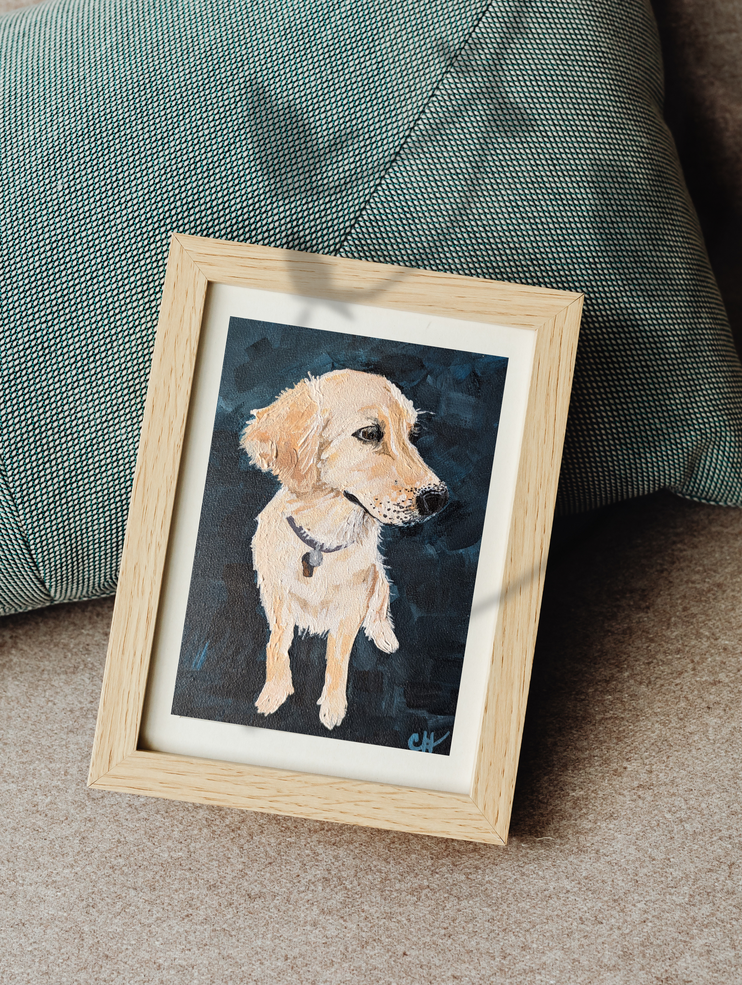An acrylic painting of your fur baby on a 6" X 8" canvas board. Canvas board can be placed into any picture frame with a 6" x 8" opening, making it the perfect customizable gift! Frame not included.
